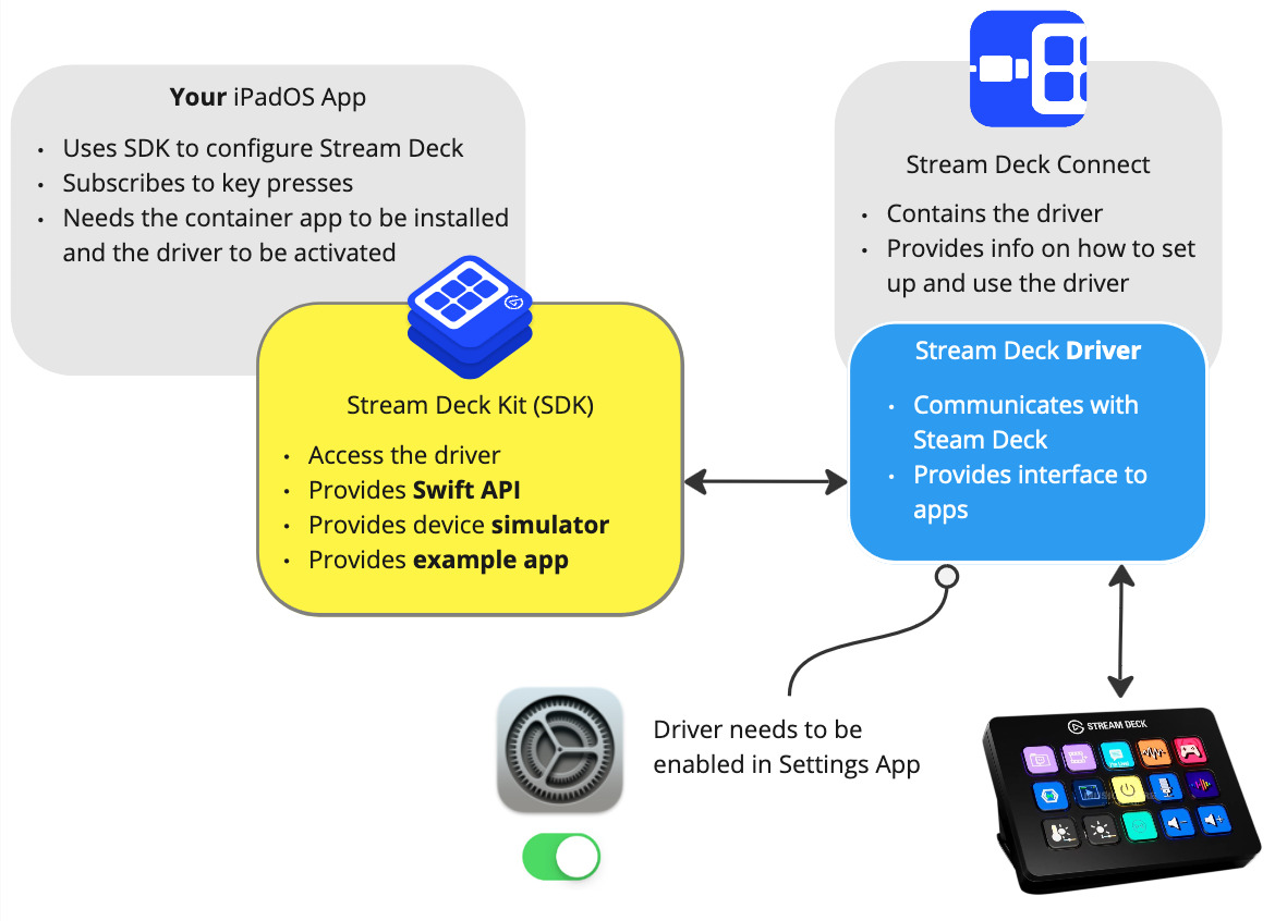 Users download the Elgato Stream Deck Connect App from the Apple App Store, which holds a driver for the Elgato Stream Deck devices, and are guided to activate the driver once within the iPadOS settings.