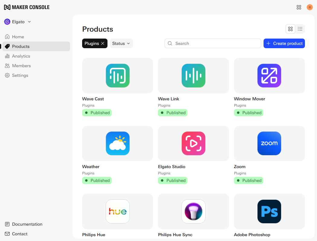 Visual list of products that includes the product's name, extension (such as plugin or icon pack), and its publish status.