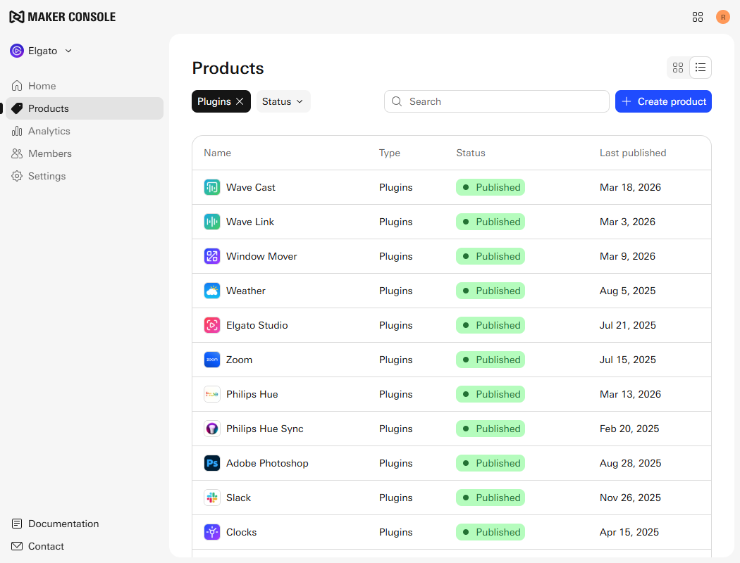 Your Marketplace products are managed in Maker Console. To access your products, log in to Maker Console and navigate to Products; this page provides a list of all of your products, including draft, published, and unpublished products — selecting a product will take you to the product's page, allowing you to update it or submit a new version.