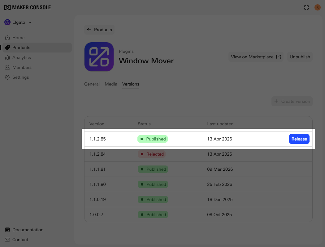 Following review and approval, you will then be able to manually release the product version in the Versions tab by selecting the Release button.
