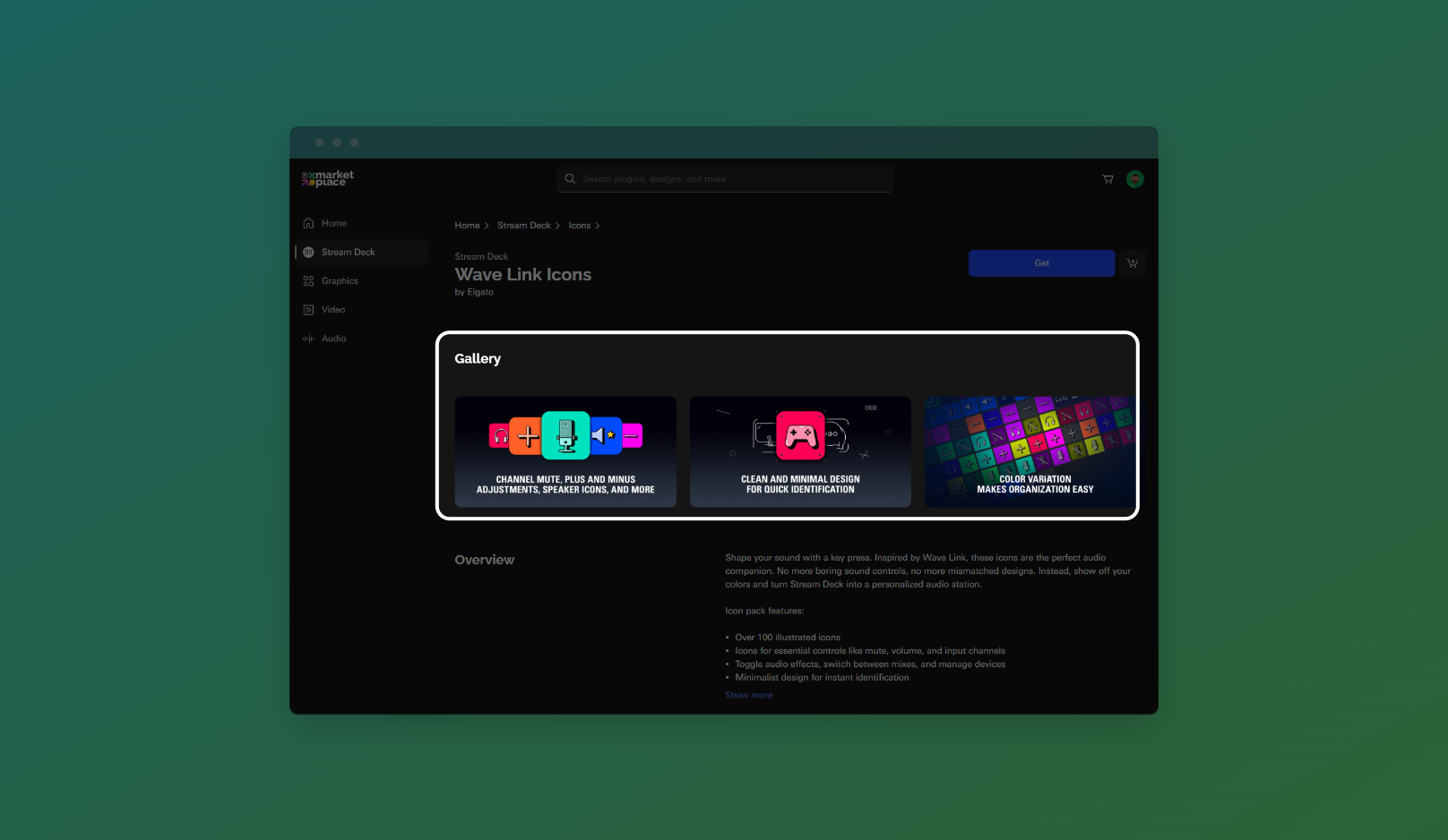 The Elgato Marketplace displays preview images for your icon pack. These images can include the user interface, helpful infographics, or marketing materials.