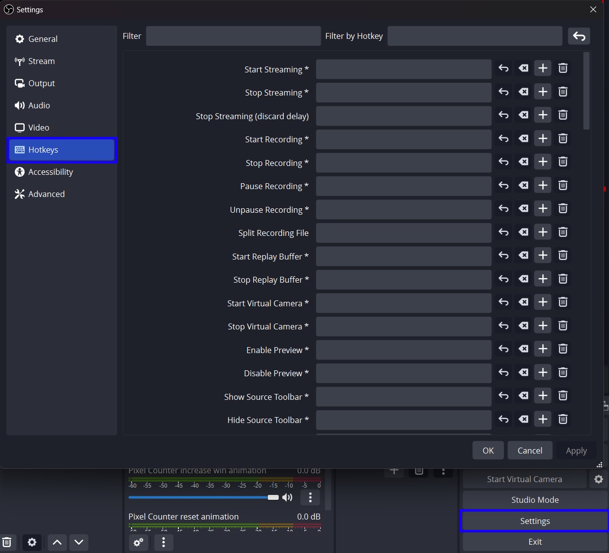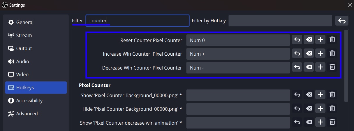 - Search for "counter" to reveal the specific Counter Hotkey controls