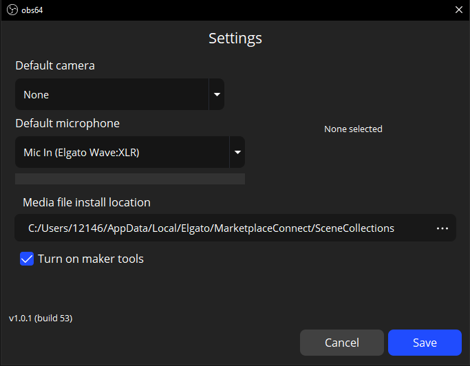 With the Marketplace Connect for OBS plugin installed in OBS, enabling Maker tools will unlock the ability to export and import scene collections for Marketplace Connect. To enable Maker tools: