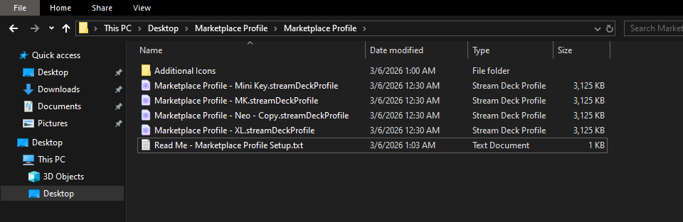 .streamDeckProfilefile along with any additional files (such as icons, guides, or scripts) into a.ZIPfile. This is the file you will upload to the Marketplace when submitting your product.